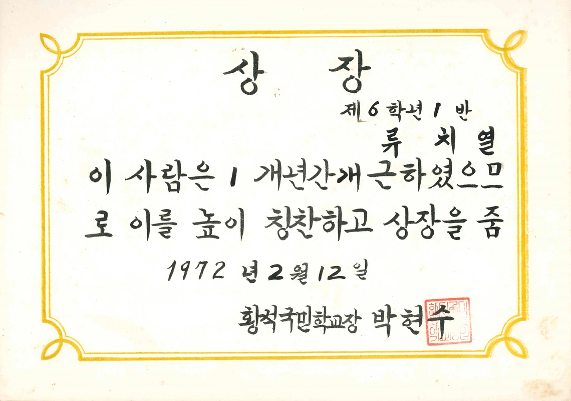 황석분교 개근상(21회 졸업생 류치열님 1972)